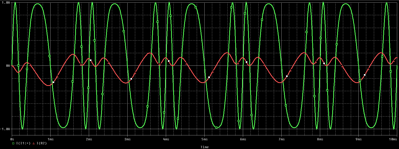 由于單個組件無法單獨(dú)檢查各個組件對輸入波形的影響,因此我們必須在較大的電路中查看這些組件。下圖顯示了一個簡單的電路,其中的FM源(1 A,1 kHz,調(diào)制指數(shù)為4)連接到Pi濾波器和電阻負(fù)載(R2)。這種類型的信號源具有很強(qiáng)的調(diào)制能力,在時域中很容易看出來,但是R2的時間行為并不總是很明顯。下面的Pi濾波器用作低通濾波器,但也可以通過互換電容器和電感器將其更改為高通濾波器。