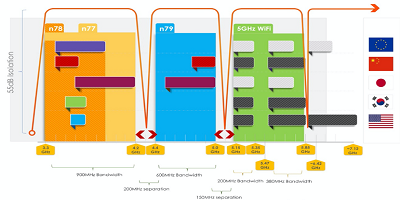 行業(yè)分析公司Navian的一份報告總結(jié)了這種共存問題:“ Wi-Fi5 GHz頻段對智能手機至關(guān)重要,它位于4.5 GHz67 GHz頻段之間。如果要充分利用這些頻率,則每個帶寬都需要一個陡峭的濾波器。同樣,對于n77n79 5G頻段,由于200 MHz的頻段間隙太窄而無法充分利用,因此同時需要用于這些頻段的高性能濾波器。