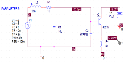例如,讓我們看一下使用PSpice中的瞬態(tài)分析的BJT晶體管的輸入引腳與其參考平面之間的耦合。下圖顯示了一個(gè)示例電路,其中包括對(duì)短傳輸線上的寄生進(jìn)行建模的電路。短線上的電感器和電容器(分別為L1C1)以及電阻器模擬輸出端帶有一定電阻的短傳輸線行為。該系統(tǒng)中的源是范圍為05 V的脈沖源,其上升/下降時(shí)間為2 ns,重復(fù)頻率為100 ns10 MHz)。晶體管Q140237 NPN晶體管。