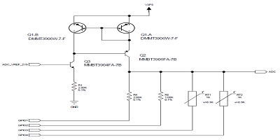 該設計將Q1-Q3晶體管與R1電阻結合使用,以形成一個恒流源,該源使用2.5V ADC基準電壓源提供約1mA的電流(見圖)。當相應的GPIO引腳被驅動為低電平時,校準電阻R4R5以及RT1RT2 RTD傳感器可以吸收該電流。不用時,GPIO引腳為三態(tài)。在ADC輸出端測量電壓。